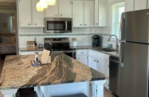 Inside, you'll find a lot to love. The cottage was recently remodeled, and everything is extremely new and clean. The kitchen has beautiful granite counter tops, all new stainless steel appliances, a large pantry, and everything you need to prepare fabulous meals in the comfort of your very own beach cottage. The living area is equally inviting and includes a 42-inch flat screen TV, and a Blu-Ray/DVD player. You'll also find a washer and dryer in the pantry.
