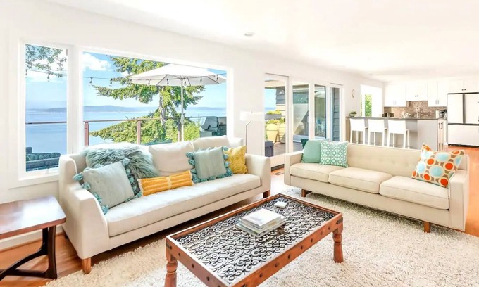 Escape to this serene retreat with breathtaking views of Puget Sound and the Olympic Mountains. Located in the desirable West Seattle neighborhood, this cozy yet spacious home offers the perfect blend of tranquility and convenience, just minutes away from local shops, restaurants, and Seattle’s iconic landmarks. This beautifully designed home features large windows that frame panoramic water views from nearly every room. Enjoy your morning coffee or evening cocktail on the expansive deck, while watching the boats go by and the sun set behind the mountains. Inside, the open-concept living area invites relaxation with comfortable seating, a modern kitchen, and tasteful décor.