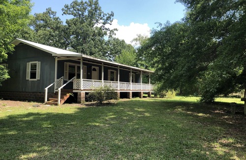 We are ready! Are you? Spacious two bedroom (three twins beds, one full, and a queen bed) and two bathroom home on five acres, near Logan Martin and Talladega. Large area for hosting a cookout. Also, there is a full length front porch and screened back porch to relax and curl up with a good book. There is an electrical outlet on both porches and one electrical outlet on the outside of the back porch (can charge boats). We have recently added a rolling pier. Enjoy a short trek to the water and maybe catch fish for supper.
