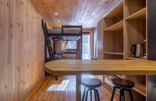 The kitchenette is equipped with a refrigerator, as well as an espresso maker, an electric kettle, and a microwave. Other amenities include heating, limited housekeeping, wardrobe or closet, and change of towels on request.