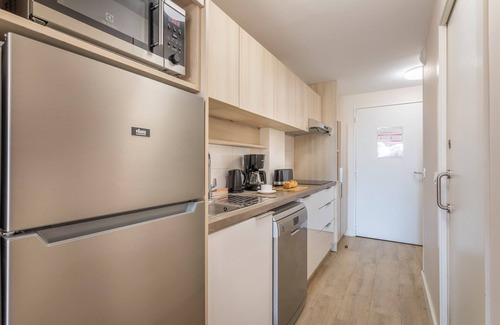 While you're here, you can enjoy all the comforts of home and more, including a stovetop and a dishwasher, as well as WiFi and an LCD TV. Other amenities include laundry facilities, towels, an electric kettle, and kitchenware and utensils.