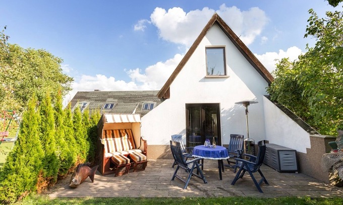 Maritime and modern furnished 2-storey holiday house (45 m²) with 2 sun terraces and surrounded by old fruit trees on a large garden plot. For 1 - 4 pers. (1 extra bed 12.50 € / night) - with under occupancy (only 1Pers. 12,50 € / discount p. Day) Please note: narrow spiral staircase to the upper floor!Two sun terraces with patio furniture, beach chair, barbecue and radiant heater. Ground floor: Living room with flat screen TV, DVD / CD player, radio, double sleeping lounger (spring 1.40 x 2.00 m), table, 2 armchairs, fitted kitchen with electric stove / oven, fridge / freezer, coffee maker and toaster, Shower / WC Upstairs: large bedroom (open Wendeltrppenzugang) with collapsible single beds 0.80 x 2.00 m (box spring quality), closet, passage into the small bedroom - small bedroom with box spring double bed (1.80 x 2.00 m) 2 armchairs, Cloakroom bar on site including: organic welcome drink bed linen (before and after season) WLAN touring bicycles free (low season) pets (off season)