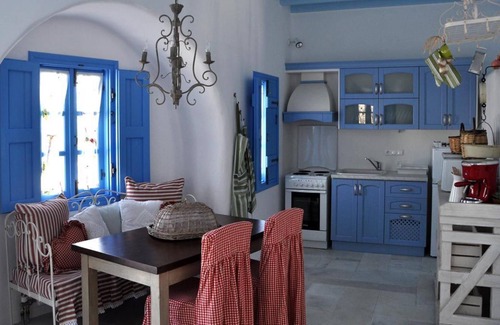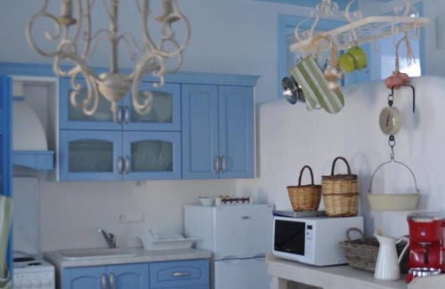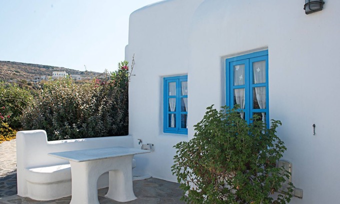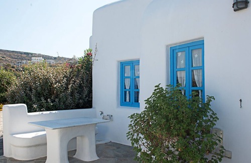 Villa Kleio (around 75 m2) offers 2 bedrooms, (1 double-bed bedroom, 1 bedroom with two single beds, A/C), 1 bathroom, fully equipped kitchen, living room with sofa bed large enough for any adult, and fire place. Extra bed available in the living room. Panoramic views towards the Aegean sea and Naxos town. Private parking, and garden with dining facilities.