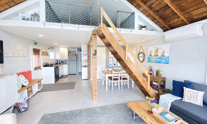 The loft has an additional A/C unit and a fan to keep cool. There are open-style wooden steps up to the loft. It has lower ceilings and peaks at 5' in the middle.