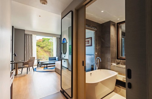 Bathrooms include bathrobes, designer toiletries, hair dryers, and toothbrushes and toothpaste. Business-friendly amenities include desks, desk chairs, and phones. Additionally, rooms include complimentary bottled water and coffee/tea makers. Change of towels and change of bedsheets can be requested. Housekeeping is provided daily.