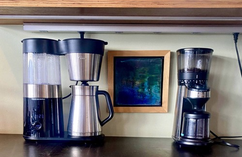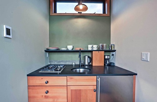 The home has principal views to the west and north. Sun bathes the interior all year (though there are shades for those summer afternoons). 360-Degree Views. Heated Floors. Open Concept Layout. The main house is one larger space with a master Queen bedroom with full bath. Just outside, on the west side, is a covered patio, with lounge furniture, Adirondack chairs, and gas grill. The kitchen is fully equipped, with dishes, flatware, glassware, there is a pour over style coffee maker and a burr grinder, ice maker, microwave and toaster.