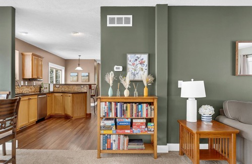 -Kid's Room has a bunk set - double below and twin up. Trundle twin mattress underneath the bed you can pull out. Also for the young ones: chair booster.
