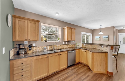-Granite counters and a large, well-equipped kitchen. Two small eating areas + bar stools. Coffee maker and toaster. New stainless appliances.
