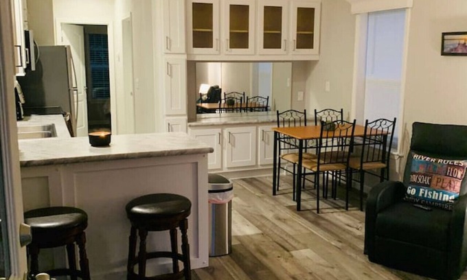 The Rainbow River Bungalows is the perfect destination for a fun and restful getaway! Stay in one of our private units and have all the conveniences of an outdoor paradise just outside your door! Enjoy FREE access to the Rainbow River via the Marion County KP Hole Boat Ramp, perfect for launching your boat or kayak. Our community center has a huge chess and Connect Four boards, so you can challenge yourself or your friends. Grill the perfect dinner on our outdoor grills or roast some S'mores by the fire! Dogs and kids will love the dog walking area and public garden beds. Take a leisurely walk and enjoy hammocks for a great afternoon of relaxation. Unit S is a spacious one bedroom with an open floor plan and an inviting front porch seating area. Get ready for an unforgettable getaway when you choose the Rainbow River Bungalows!