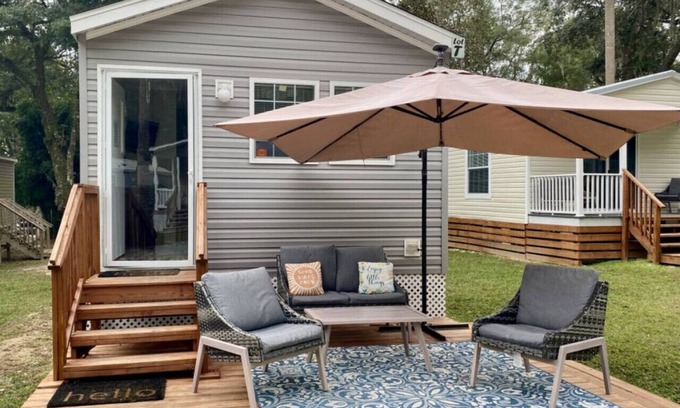 The Rainbow River Bungalows is the perfect destination for a fun and restful getaway! Stay in one of our private units and have all the conveniences of an outdoor paradise just outside your door! Enjoy FREE access to the Rainbow River via the Marion County KP Hole Boat Ramp, perfect for launching your boat or kayak. Our community center has a huge chess and Connect Four boards, so you can challenge yourself or your friends. Grill the perfect dinner on our outdoor grills or roast some S'mores by the fire! Dogs and kids will love the dog walking area and public garden beds. Take a leisurely walk and enjoy hammocks for a great afternoon of relaxation. Bungalow E is a spacious two bedroom, two bathroom open floor plan unit with an inviting front deck seating area. Get ready for an unforgettable getaway when you choose the Rainbow River Bungalows!