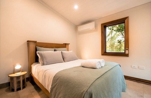 The retreat offers an outdoor spa nestled under a gazebo overlooking the valley. A queen bed lays in a large open bedroom with bathroom to one side and laundry conveniently hidden along the back wall. A handcrafted coffee table and couch sit at the end of the room, beside French doors which lead out to the gazebo. Large windows frame the view through to the private tropical garden. The main living area features full kitchen with butlers sink, island cook-top and amenities overlooking the rear garden, with a door leading out to the expansive lawn from which to enjoy the magic and brilliance of the night sky.