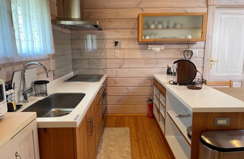 There is one large Americanmade camping trailer house fully equipped with air conditioning and heating a kitchen bathroom toilet and sink two bedrooms and a wooden terrace where you can enjoy BBQ Up to three people can be accommodated