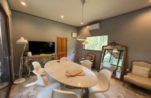 This is a vacation rental style facility You can have a great time on the spacious covered wooden deck where you can BBQ and the openair bath made of cypress while relaxing and looking out at the forest Outside the 24tatami modernstyle living room is a villa with a lawn garden surrounded by trees The covered BBQ deck comes with a dining set and sofa set and you can watch the stars whi