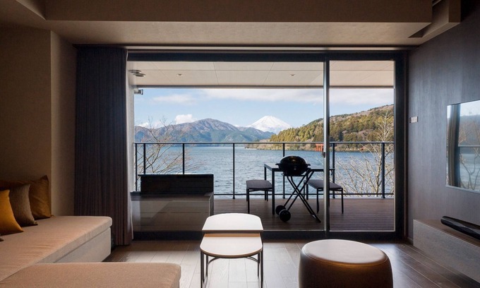 Enjoy a luxurious stay on the shores of Lake Ashi with a panoramic view of the torii gates of Hakone Shrine and Mt Fuji