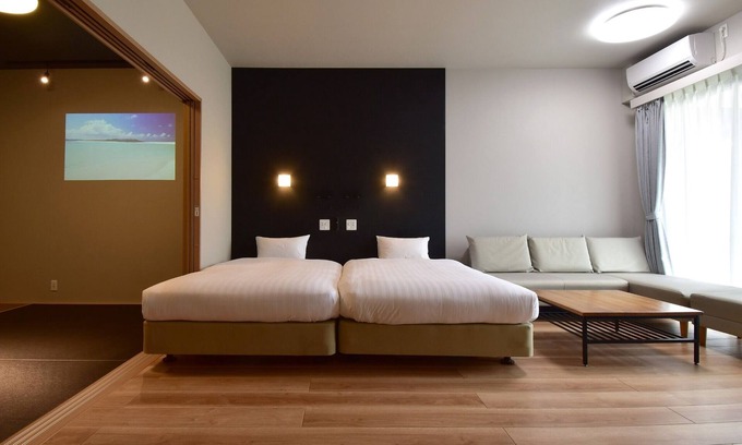 Counter kitchen with cooking utensils and tableware bed sofa dining and bedroom Japanesestyle room with Ryukyu tatami projector popIn Aladdin