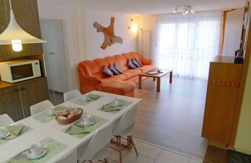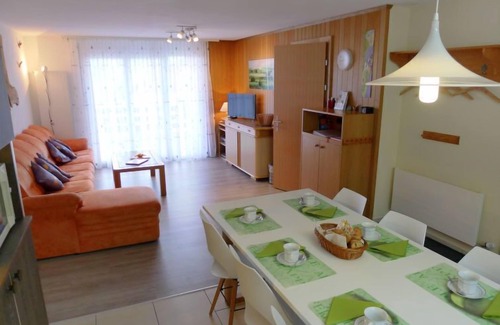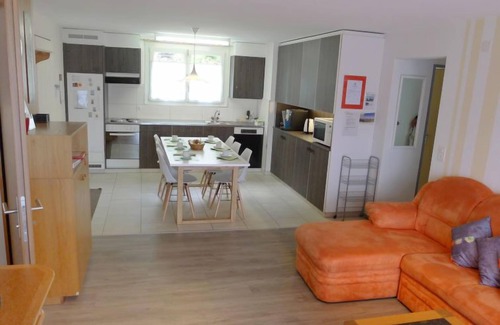 "Ramabrice", 4-room apartment 65 m2, on the ground floor. Comfortable and cosy furnishings: living/dining room with cable TV, flat screen, video and DVD. Exit to the terrace. 1 double bedroom with 1 double bed. 1 children's room with 2 beds (90 cm, length 190 cm). 1 room with 2 beds (90 cm, length 190 cm). Open kitchen (3 hot plates, oven, dishwasher, microwave, electric coffee machine, raclette grill, fondue Set (cheese)) with dining table, dining nook and heating stove. Bath/WC. Large terrace 40 m2 partly roofed, patio 20 m2, partly roofed. Terrace furniture, barbecue, deck chairs (4), box-room. Partial view of the lake, the mountains, the valley, the countryside and the resort. Facilities: children's high chair, baby cot for up to 2 year olds (extra), hair dryer. Internet (WiFi, free). Parking (1 car) at the house. Please note: non-smokers only.