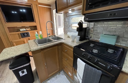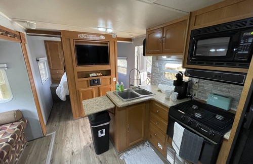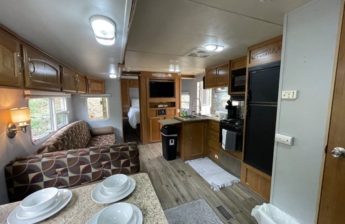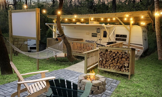 Ramblin Rose Luxury Camper is a semi-secluded mountain vacation retreat in nature! Book now to enjoy a fully-equipped 30 ft camper nestled in the serene woods, perfect for family fun or groups of up to 8. Relax in the hot tub, cook on the griddle, and gather around the fire pit on the deck for a fun-filled vacation. Watch movies on the 120" outdoor theater and explore nearby hiking trails. Dine al fresco with our ample kitchen and outdoor dining area. Don't miss out on this unforgettable getaway!