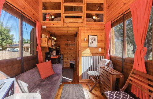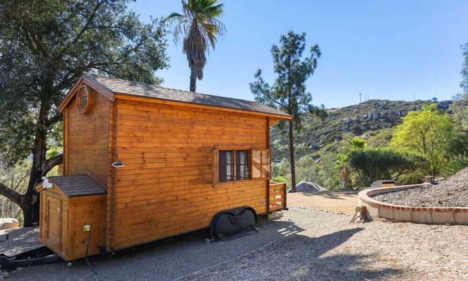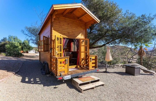 This Tiny Cabin is located on beautiful 8 acres in Ramona Wine Country. Walking distance to Turtle Rock Ridge winery and many more nearby. 600 acres of open space preserve next door with miles of trails. Enjoy a pool in the summertime. Forever views to enjoy from your private patio area. Comfy queen size bed in the loft (remote control stairs)Refrigerator, freezer, microwave and coffee pot. Less then an hour from downtown San Diego and within an hour from all areas of San Diego County. 21 years and older only. FYI. This is a thin walled cabin and not meant for heat or cold sensitive people. I have a window AC and a heater and fans. There is a fabulous pool and nice shade trees and a cabana to keep cool. Ramona most of the time has nice cool evenings that you can open the windows and enjoy the fresh air. This is the country so you may encounter ants, spiders, insects, rodents, coyotes, snakes, bobcats etc. I do everything in my power to keep outdoor things from coming in:) Two golf courses, many restaurants and music venues.Please reach out with any questions. Come Glamping! You will love it!