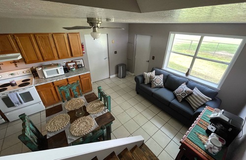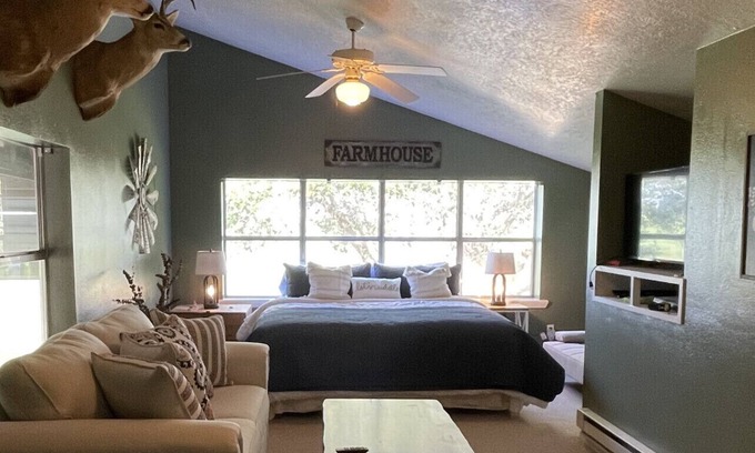 Enjoy our barndominium secludedly located on 400 acres!! Our barn apartment is completely furnished with a 1 bedroom, 1 bath, kitchen and living areas. Bring the whole family and enjoy two bass fishing ponds, pedal boating, tents, campfires, beautiful sunsets, grazing cattle and most importantly the peace and quiet of the country life. Bring your bikes, pets and friends!! We have fire pits, bbq pits, gas grills and smokers. Splashway is just 20 minutes away or go into town and enjoy our newly built splash pad. Sleeps 6, king size bed, futon/sofa bed and trundle beds. We also have the the perfect spot for your travel trailer or rv!! We have accommodations for all you fishermen and hunters out there!!