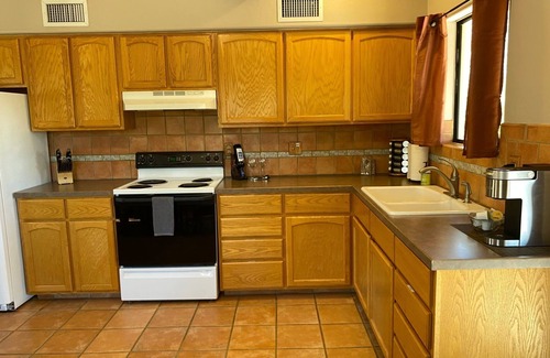 This clean, furnished home includes a cozy living area with a large picture window of the Catalina Mountains, a beehive fireplace, and a flat screen TV with firestick. The full size kitchen includes a dining table for four, a full size fridge/freezer with icemaker, electric stove/oven, microwave, a Keurig brewing system and traditional coffee pot, blender, and all other utensils and dish ware to feel at home. The bedroom offers a comfortable queen size bed that guests love, an armoire and nightstands, and a large walk-in closet with a full-sized washer and dryer. The bathroom has a shower and large vanity with plenty of counter space, and drawers for storage. Our linens are replaced regularly to ensure cleanliness and comfort!