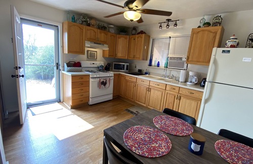 This updated home sits at the end of a ranch property with the owner's home nearby. Beautiful views of Grand Mesa and the Adobe Buttes are the backdrop of this serene valley. Watch an occasional horseback rider in the arena outside the front porch, listen to the sounds of Tongue Creek and Surface Creek from the back patio, or enjoy a bonfire under the stars! Feel free to walk the grounds and enjoy the peaceful setting on 70 acres. This 2 bedroom ranch house accommodates 4 adults comfortably with a pull out couch for additional guests. Our "petting zoo" includes chickens, 5 Nigerian Dwarf Goats (who LOVE attention) and a miniature horse named "Johnny Cash". For a small $25 fee, kids under 50lbs can request a 30 minute ride lead by one of the property owners. Parents are encouraged to walk alongside and take some photos! Feel free to walk around and meet anywhere between 18-25 horses at the ranch, spread out over several separate corral spaces. Most of them love the attention and each has a unique story that adds a personal touch to our home in the valley. This is a true Colorado experience for young and old alike.