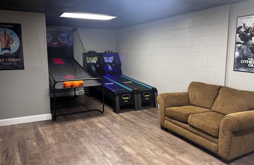Electric fireplace. Open space concept. All three bedrooms & two bathrooms are located upstairs. The middle floor is the main central hub of the home with the family, dining, kitchen laundry room, & gathering area with a large fireplace. The lower level has a 86” smart TV pool table, air hockey, basketball hoop, & skeet ball games for hours of entertainment.
