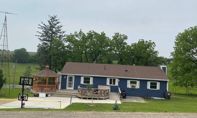 Rest, relax, and recharge yourself with family or friends. Stay comfortably in the serenity of this peaceful countryside in the heart of Jo Daviess county not far from Galena, Illinois, at this marvelous renovated 3-bedroom ranch style farmhouse on main level and an additional lower level bedroom and half bath. 3 queen beds, 2 twin beds, with additional sleeping options, at this peaceful cozy retreat perfect for families or groups of friends. Enjoy the convenience of WiFi, heating, and AC, along with a fully equipped kitchen for preparing delicious meals. Dine inside or outside with our many seating options. Relax in home away from home comfort after a day of exploring the Jo Daviess county in the northwest corner of Illinois and the surrounding tri-state areas
