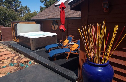 We are located in the high desert above Palm Springs with 15 degree cooler weather at a 4000 ft elevation. The back area stays at around 70 degrees in the winter. Enjoy the full sun in all seasons. Our property is a half acre and is fenced in on both sides for privacy, bordering the Bureau of Land Management National Forest. The back area of the property is private, exclusive and has a well maintained freshwater jacuzzi and high powered rock steam sauna that includes eucalyptus aromatherapy. Located on the property is also a fun little art gallery that features paintings, glass, wood sculpture and jewelry. by local artisans.
