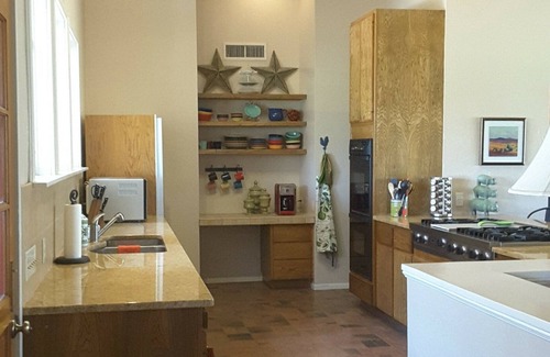 The inside living space description would not be complete without mentioning the kitchen. There is plenty of space for multiple cooks and for those who want to visit while the cooks do their thing. The kitchen has been completely furnished with all types of cookware and dishware. Want dishes for every day; use the fiesta ware. Want dishes for the patio or pool area; use the desert plastic ware. Want dishes for a special occasion; pull out the china. We have you covered for all possibilities. The 6 burner Viking chef quality stove with built in griddle and dual oven make great cooks out of everyone. Added benefits to this kitchen include a microwave, a separate ice-machine and a stand-alone subzero refrigerator. There is also a full size freezer in the laundry room. The walk-in pantry has plenty of space and is stocked with some basic cooking supplies which also includes an array of spices. An assortment of pots and pans and small appliances for cooking and baking have been stocked for your use in this gourmet kitchen.