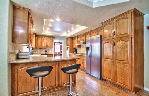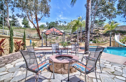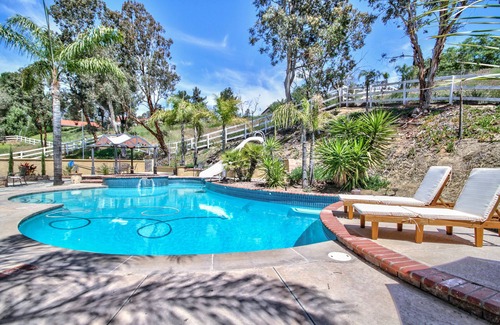 Your stay at Rancho Vista includes access to exceptional amenities that cater to both relaxation and entertainment. Enjoy the expansive outdoor grounds featuring a large swimming pool complete with a slide, a 10-person jacuzzi, and inviting BBQ area ideal for evening gatherings around the firepit. The interior boasts roomy living spaces, including a family room, game room equipped with a pool table and poker table, and comfortable bedrooms accommodating up to 14 guests—ensuring everyone you love can be part of your wonderful wedding experience.