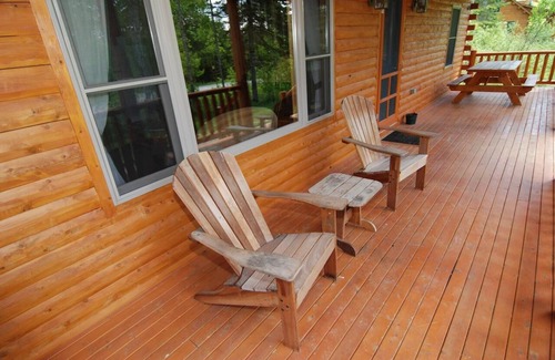 The property itself is a single-level, 2-bedroom duplex cabin with shaded porch, fireplace, full kitchen, and washer/dryer. There are beds for 4 (1 queen, 2 twin).