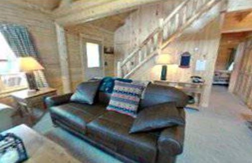 Cabin affords conveniences of modern amenities, appliances and central hot-water heating. Kitchen includes refrigerator, stove with oven, microwave and dishwasher, along with coffee maker, toaster, pots, pans, dishes and utensils. Living room has a cozy stone fireplace, satellite TV and DVD player for entertainment. Washer and dryer for convenience in the cabin. The master bedroom suite also has its own satellite TV and private bathroom. One of the two additional bedrooms has twin beds, the other a queen bed, and sofa bed in living room.