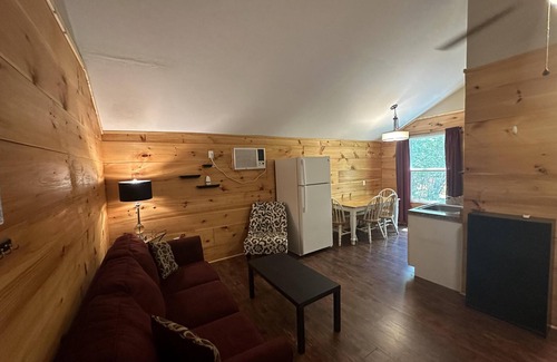 This charming cabin features a queen-sized bed and a twin-over-full-sized bunk bed, ensuring comfort for the whole family. The cabin includes essential amenities such as a fridge, microwave, and a private bathroom. As a guest, you'll have full access to Jellystone Park amenities, including the refreshing pool, the engaging activity center, and the serene fishing pond. Please note that linens are not provided, so be sure to bring your own sheets, blankets, pillows, and towels.