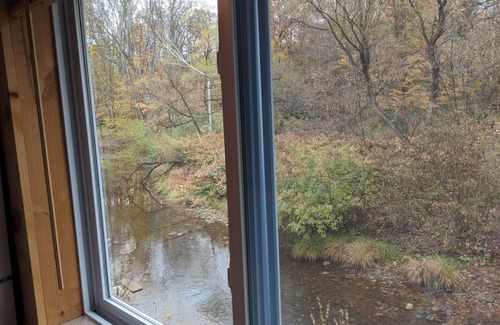 Unique creek front condo 10-15 miles from State College and Penn State. Very comfortable, spacious and peaceful condo. Full eat in kitchen . Awesome creek view. Cozy living room w/queen sleeper sofa, wood burner, dining area and a balcony. Big bedroom w/queen bed, couch, desk and full bathroom w/washer and dryer. Cabin style small bedroom w/futon that opens to a twin bed. Private entrance w/ attaced porch. 10-15 minutes spectacular Mountain View drive to State College. Tussey Mountain Ski and Recreation area is just 20 minutes’ drive away. Property is privileged to be conveniently located at about the same distance to State College, Philipsburg and Black Moshannon State Park. Bald Eagle Creek could be reached with the fishing pole right from the balcony. Stocked and Rainbow trout, Smallmouth bass, Rock bass are yours if you are lucky to catch one. You could simply enjoy spectacular view of the creek and surrounding beauty sitting on the porch. The Way fruit farm in Stormstown is just 4 miles away. Skytop Mountain Golf Club is 3 miles away. Port Matilda Community Park is a mile away, Lykens Market /Gas station and Brother’s Pizza are less than a mile away. Walmart, Target, Wegmans about 10 miles away. Place is great for a getaway, vacation ,special occasion.