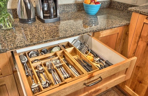 Royal Retreat is a modern home. You can feel the care that went into each detail, from the rustic Shaker-style cabinets and doors to the handmade wooden staircase. One of the unique features is you do not climb stairs to access the front door. This is rare in our area; most rentals are on a hill, and you haul your bags up flights of stairs to enter. Also unique is central air conditioning for your comfort, more functional than mini-splits and not common in our area. Royal Retreat's guest bedroom, which offers a king-size bed, is on the first floor with a bathroom right across the hall, making it perfect for guests who are less mobile.