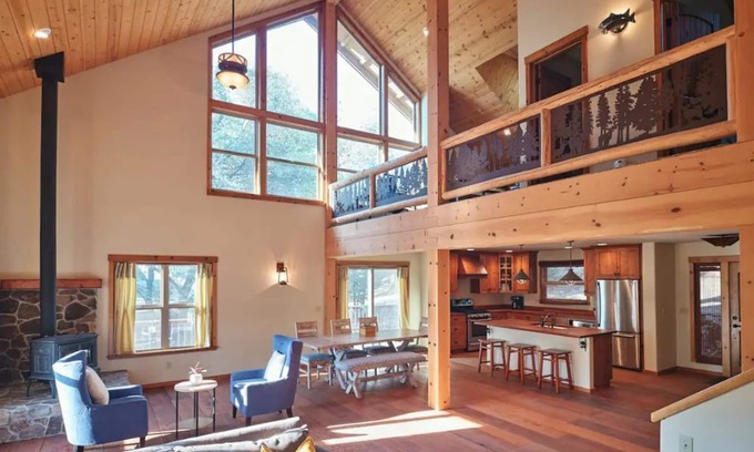 Your lake inspired daydreams will come true at this gorgeous mountain cabin with 30+ foot vaulted pine ceilings, rustic details, fast internet and great cell service — making this the perfect backdrop for your family memories. Only 2 miles from Bass Lake and 24 miles from Yosemite National Park, this open floor plan custom built home will let you escape your daily stresses and reconnect with nature. Located in the Sierra National Forest, come to play, come to let go, come to work, or all three!