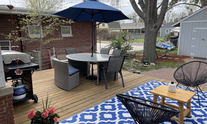 Going back upstairs and just off of the living room, out the French doors, you'll find a very peaceful backyard with a quaint patio area that includes an outdoor built-in fireplace which you are welcome to use. A step down from the patio is a deck with a gas grill, a large dining table and chairs, and several other seating options. This is a wonderful place to relax under the shade of the trees or go out and hammock or swing for a while. Just off the deck, you will observe some of Nebraska's funniest wildlife including acrobatic squires, numerous species of friendly birds, and even a (pet) rabbit can often be observed on a regular basis running around the backyard. There is a tree hammock swing and fairy garden for kids and adults to continue to feel welcome to create & change. and add to right off the deck.
