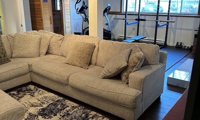 Comfortable space that is literally home away from home. With all the necessities that you expect from your home, with additional perks such as a home gym! Elliptical, stationary bike, bench press, squat bar, free weights and an infrared sauna. Two separate spaces with 75 and 83 inch tv’s. No need to fight for bathrooms, there are two and a half for your stay. The backyard is lined with trees and is very private.