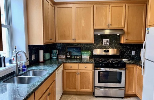 Bedroom faces Pleasant Street and is quiet and bright. King bed and 55 inch The Frame Samsung TV with Netflix, HBO and Hulu.