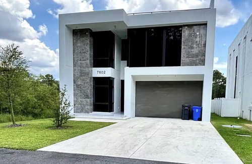 Escape to this luxurious 4-bedroom, 4-bath oasis tucked away on a private road. With stunning modern architecture and unbeatable curb appeal, this home offers a serene retreat surrounded by peaceful trees and open fields, where wildlife roams freely. Enjoy the pool, outdoor dining area, and cabana, or take in the views from the full rooftop space. Fully equipped kitchen, plush towels, and everything you need for long stays. This lovely property offers a pleasant and soothing atmosphere for guests. Enjoy the convenience of WiFi, heating, a washing machine, and AC during your stay. Perfect for those seeking privacy, relaxation, and elegance in nature.