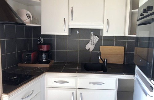 The kitchen is equipped with an oven and a stovetop, as well as a coffee maker, an electric kettle, and cookware. Bathroom amenities include a hair dryer, towels, and toilet paper. And there is a laundromat nearby so you can pack a bit lighter. Other amenities include a BBQ grill, bed sheets, heating, and a dining table.
