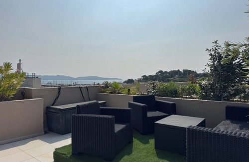 Superb air-conditioned T3 of 70m² in a new residence, extremely rare product, very well located, garage, roof terrace of 50m² with a 360 ° view of Cavalaire and the sea.