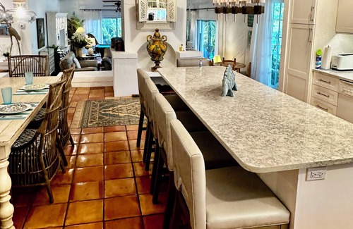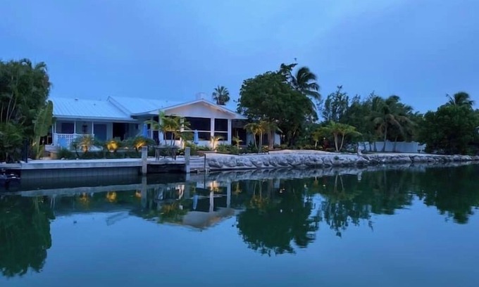 Relax in this spacious and serene space with 3 large bedrooms with 3 en-suite baths, plus additional full bath near pool. Kayaks, paddle boards, ping pong, bicycles and pool table! 8 guests only, 6 adults & 2 children. 28 night minimum rental . 12 miles north of Key West. Located on a crystal clear 70’ wide canal. Easy access to ocean and Gulf -Snipes & Marvin sandbars! Park your boat in your backyard! We allow boats up 26'