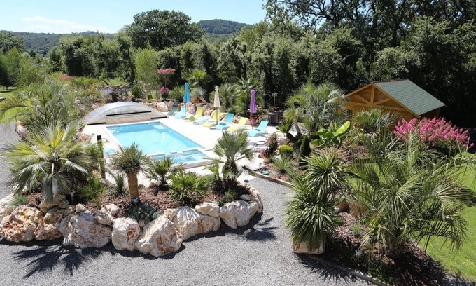 L’Oasis de Boisset is located on a vast area of 5800m2 of an enclosed and wooded area, comprising the Villa, the Mas, two private pools, two gardens and a park:
