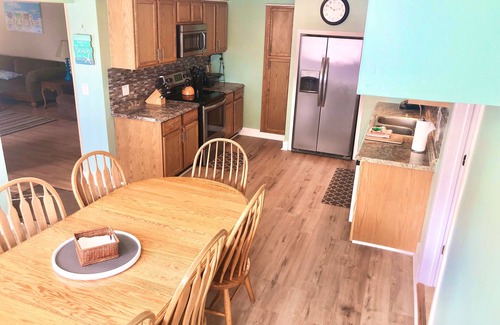 Your stay at Sandy Bottoms comes complete with exceptional amenities and features designed for relaxation and entertainment. The generously sized great room provides a welcoming atmosphere, boasting a large flat-screen SMART TV, while five comfortable bedrooms with new queen-sized memory foam mattresses ensure restful nights. The property also includes four full bathrooms for guests' convenience and a dedicated 1300-square-foot game room that promises endless fun with a poker table, ping pong, air hockey, and foosball. Outside, enjoy your morning coffee or evening glass of wine on one of two wooden decks overlooking the beautifully landscaped yard, perfect for capturing picturesque wedding photos.