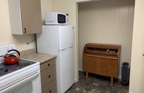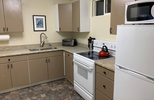 Walk out apartment on ground level of my home. Large west facing windows let in lots of light. Small courtyard with BBQ. Use of 2 one speed bikes to cruise around town.