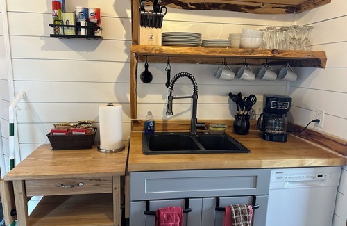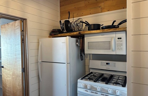 Inside, you'll find a full kitchen with a stove, oven, fridge, and dishwasher, as well as a propane grill out your back door for preparing meals. The cabin features a king size bed and 4 twin beds on built in bunk beds, a washer and dryer, and a private bathroom. Large windows to showcase breathtaking bay and mountain views—perfect for morning coffee or unwinding after a day of adventure.