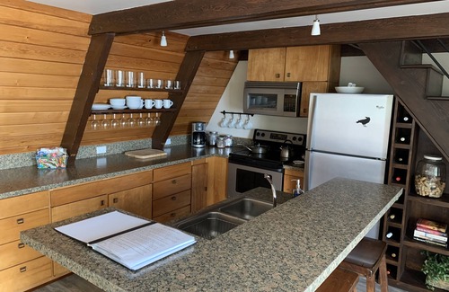This bright and airy Cedar A-Frame nestled within the trees that Eagles are perched upon, sits directly on the shores of the Pacific Ocean. Breath taking beauty and panoramic views of Sitka Sound and Mt Edgecumbe Volcano are unobstructed from the windows and the 3 separate decks. Watch for whales, otters, sea lions and eagles or even the resident hummingbird while enjoying your morning coffee or in the evening as you relax and listen to the waves.