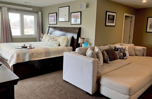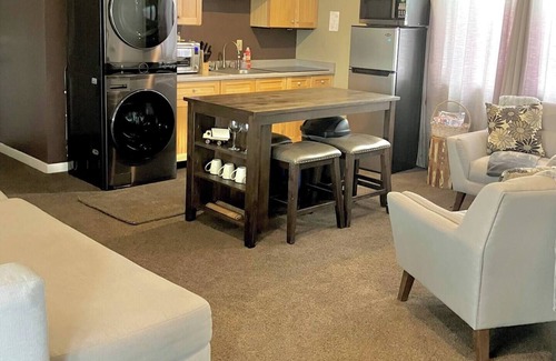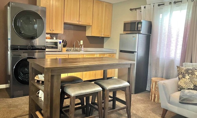 A 2nd floor private entrance for this bright modern studio filled with windows & original photography. French doors at the foot of a king bed open to the deck with your own private fire pit & grill. A large sectional, dish network, divided bathroom, kitchenette with cooktop, counter top oven, frig, microwave, dishes/cookware, coffee pot & washer/dryer. Private parking at our Ravens' Off Main location, a walkable four blocks to Main Street. A non-pet room, see spaces 9,10,11,& 12 for pet stays.