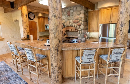 Outside, the expansive multilevel decks offer the perfect place to relax and enjoy the river views. There’s also a hot tub and large gas grill. Depending on the time of year, don’t be surprised to see fox, deer, elk and even the occasional moose venturing down to the water for a drink. (Please remember to maintain a safe distance and never try to interact with the wildlife).